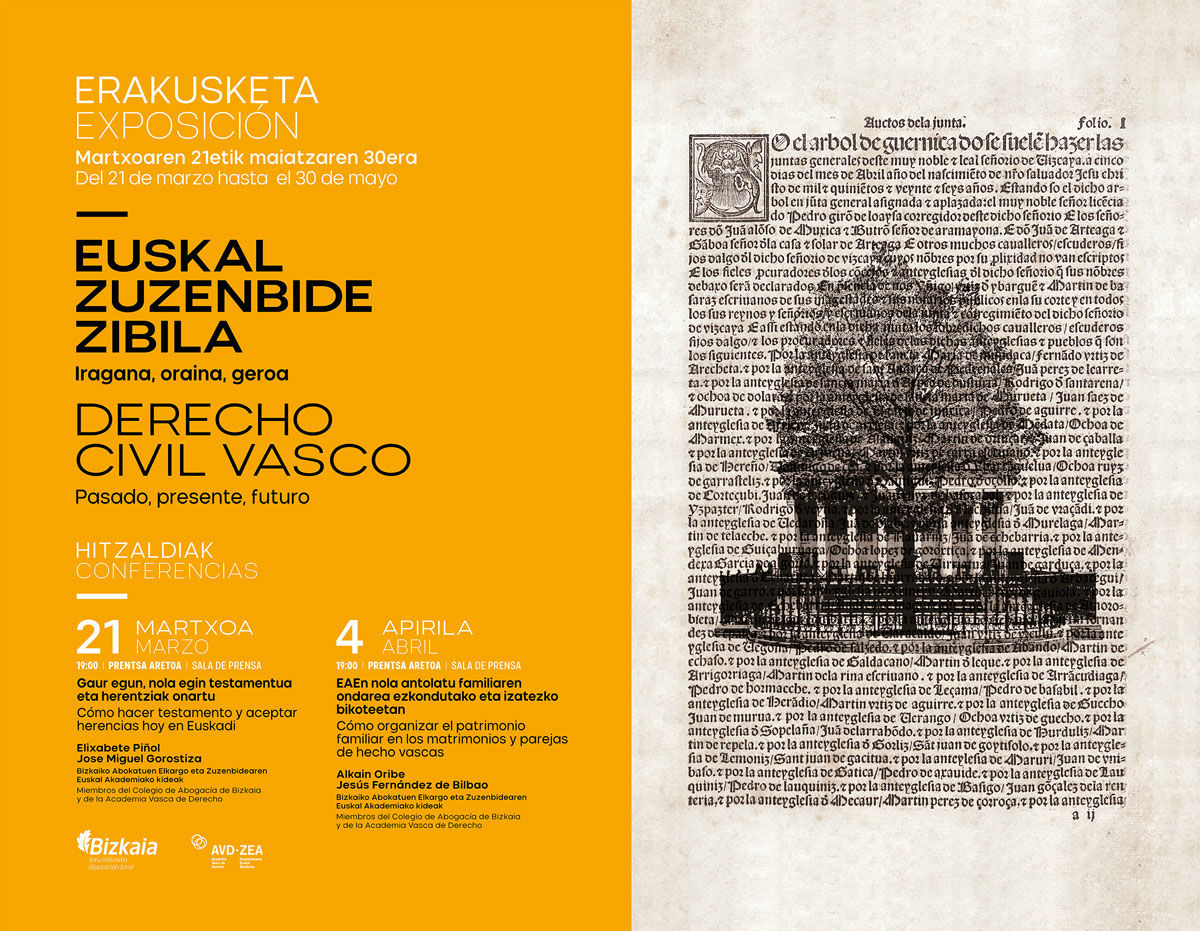 El próximo 6 de marzo, miércoles, de 9.30 de la mañana a 18.30 horas de la tarde, y dentro del XX aniversario de la Academia Vasca de Derecho, se realizará la jornada sobre derecho civil vasco con el nombre "Claves profesionales de futuro en el derecho civil vasco".